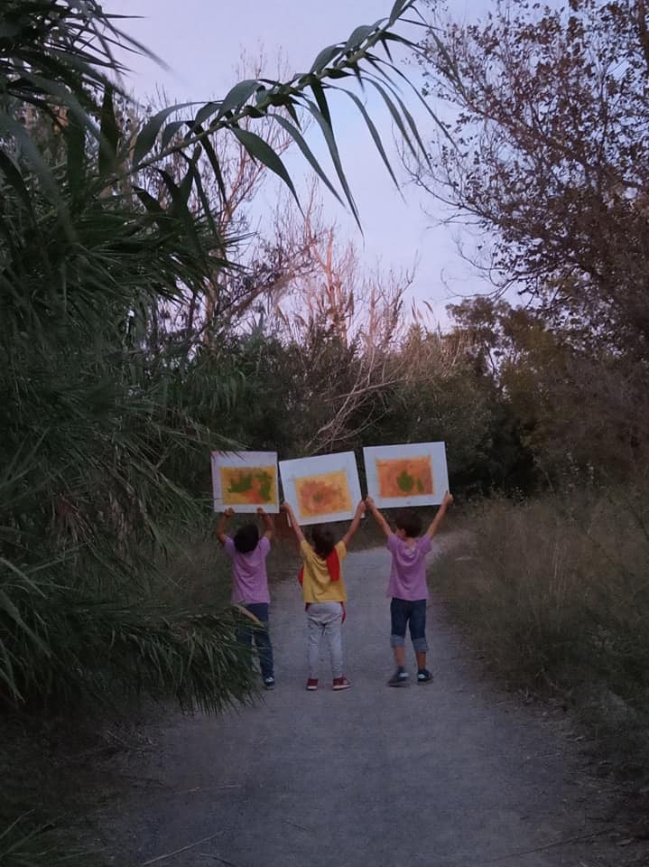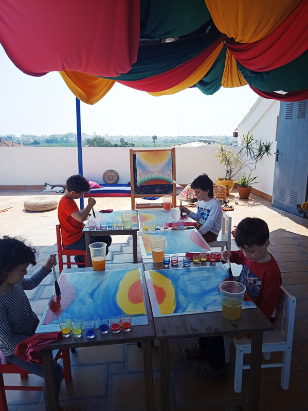 Antes de comenzar os pregunto por vuestro peque, cómo le veis, madurativamente, a nivel de carácter, sus necesidades, etc. Los talleres son siempre con grupos reducidos, máximo 6 participantes, para poder acompañar de forma individual. Cuido mucho el ritmo de expansión y concentración, aplicado al taller sería por ejemplo, comenzar encontrándonos con un saludo alrededor de la mesa y entramos en contacto desde el juego con ritmo, dando palmas en nuestras propias piernas y manos, con los pies golpeamos el suelo, presentamos nuestro nombre con ritmo. En el caso de un taller con temática estacional, la primavera, nos preguntamos qué es la primavera, qué pasa en esta estación, desde el juego con las letras entramos en movimiento y cantamos. Nos preparamos para la dinámica plástica, en este caso concreto sería acuarela con técnica guiada o no, dependiendo de la edad, disponemos todo el material en grupo y les lanzo la propuesta, color y forma general que se concreta de forma individual, cada participante realiza su propia obra, plasmando personalmente. Posteriormente volvemos a realizar juegos y dinámicas de movimiento, alternando expansión y concentración de forma saludable, respetando el ritmo de maduración infantil, biológicamente su cuerpo se está formando y necesita tanto el movimiento como la concentración. En el caso de que en el grupo haya participantes con edades diferentes y por tanto en procesos diferentes, guío la actividad adaptada a cada proceso, respetando sus ritmos al máximo. Esto la convierte en una experiencia muy saludable. Siempre al finalizar la actividad observamos todas las obras realizadas y nos recogemos en círculo, les recito un poema que ellos van repitiendo conmigo a la vez que les realizo un masaje con aceite esencial en sus manos. Pequeño ritual de despedida con frutos secos.